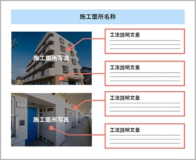 当社では建物の診断書と見積書を必ず併せてご提出いたします。調査内容に基づき的確な工事プランを立て、そのコストをご一緒に提示。誰が見ても分かりやすい提案内容となるように常に心掛けております。特に項目が多い大規模修繕においては、文字だけの書類だけでは分かりづらいため、部位ごとの写真に工事内容を落とし込むなど、分かりやすい提案書を作成しています。